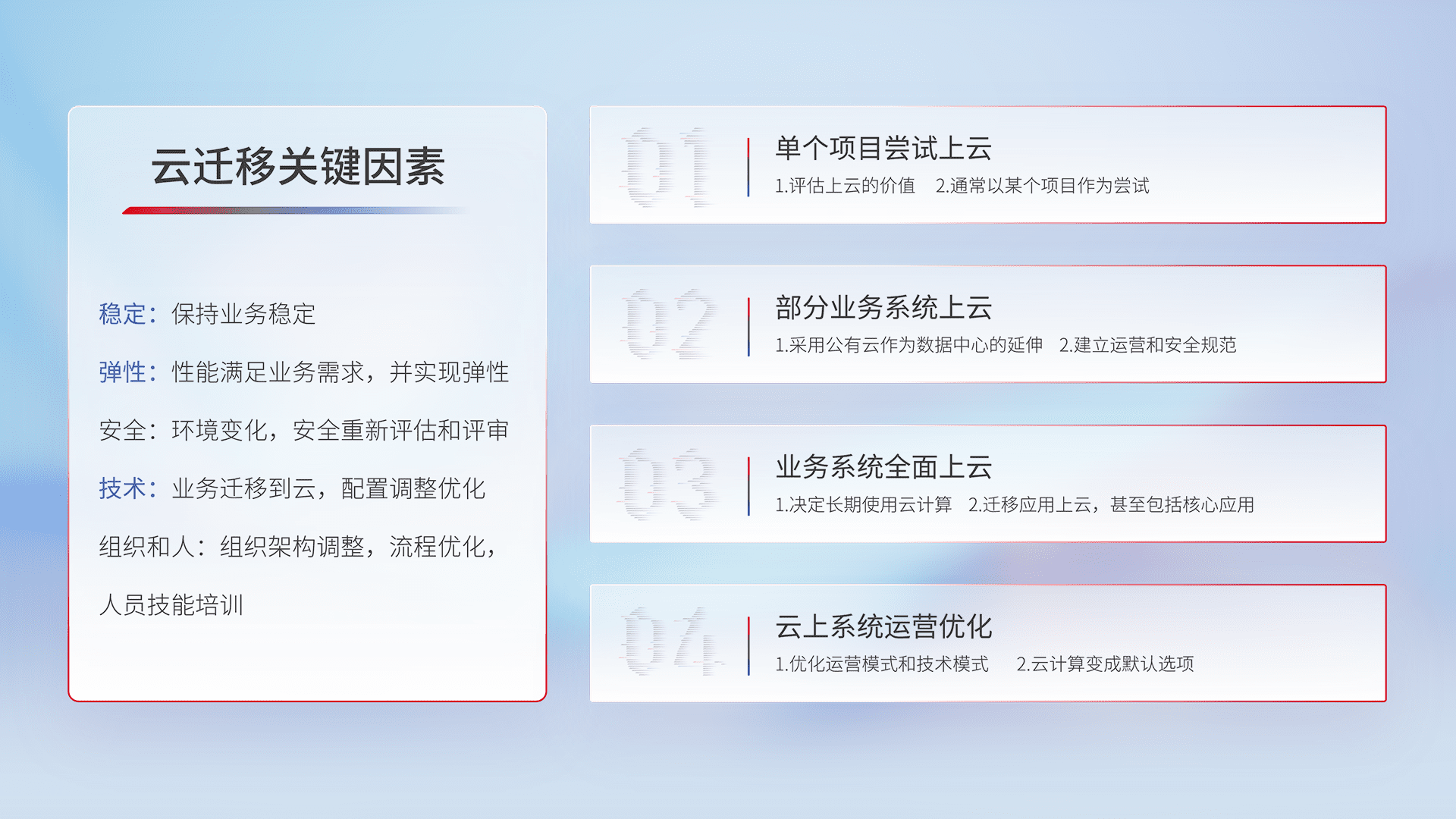 结合实际业务,,,,从规划设计、、云平台选型、、、云原生改造、、数据迁移、、、集成交付,,,,迁移全过程为客户识别最佳上云路径,,,,做好风险识别管理,,,,设计网络架构、、身份权限、、、、安全审计合规、、操作审计、、、、日志审计、、、监控告警策略、、、、多站点容灾设计等,,对云上基础设施进行整体规划,,,,提升IT治理水平,,,以满足弹性、、、、高可用、、、、高性能的需求。。